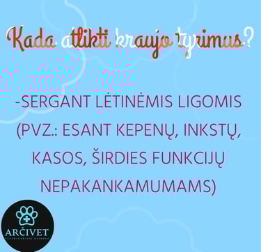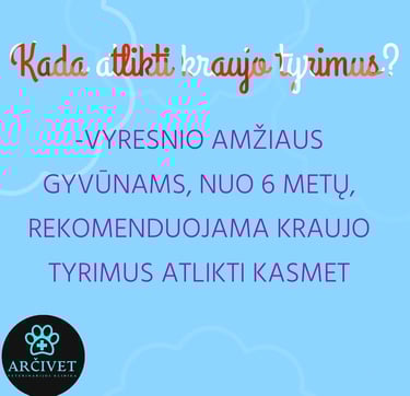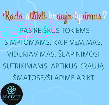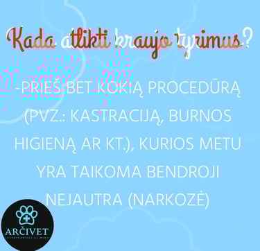 Šio tyrimo metu, sužinome apie gyvūno kraujo sudėtį (eritrocitų,leukocitų, trombocitų, hemoglobino, hematokrito ir kt. kiekį). Gauti atsakymai padeda sužinoti, ar nėra bakterinės ar virusinės infekcijos, ar nėra dehidratacijos, ar geras kraujo krešamumas.